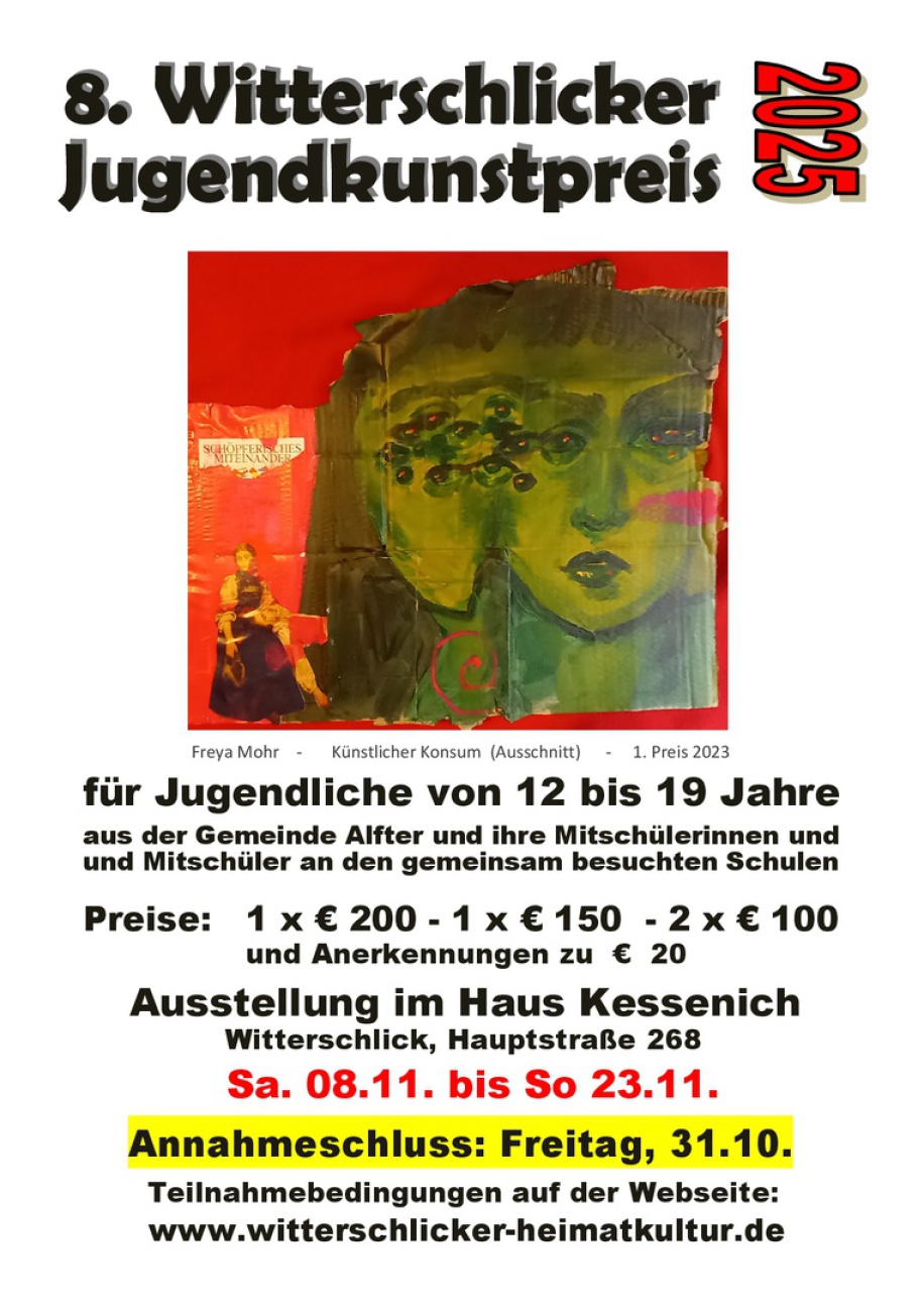 Alle zwei Jahre lobt der Verein – 2025 schon zum 8. Mal - den Witterschlicker Jugendkunstpreis aus. Im Wechsel mit ihm gibt es 2026 Jahr wieder die Ausstellung mit Werken Witterschlicker Künstlerinnen und Künstler.