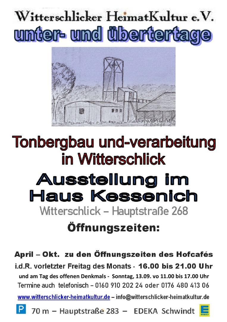 Ohne den Tonbergbau und die Tonverarbeitung hätte die Entwicklung von Witterschlick einschließlich der Ortsteile Volmershoven und Heidgen mit seiner mehrheitlich in ärmlichen Verhältnissen lebenden Bevölkerung zu einer blühenden Gemeinde mit hervorragender Infrastruktur und gutnachbarschaftlichem Nebeneinander von Menschen aus verschiedenen Kulturkreisen nicht stattfinden können. In der ständigen Ausstellung „Vom Bauerndorf zum Industrieort“, die der Verein Witterschlicker HeimatKultur e.V. im Haus Kessenich bisher gezeigt hat, war das natürlich schon thematisiert worden. Wegen der besonderen Bedeutung für den Ort sollte der Tonbergbau und die Verarbeitung aber in einer besonderen Ausstellung unter dem Motto: „Unter- und Übertage“ vertiefend behandelt werden.